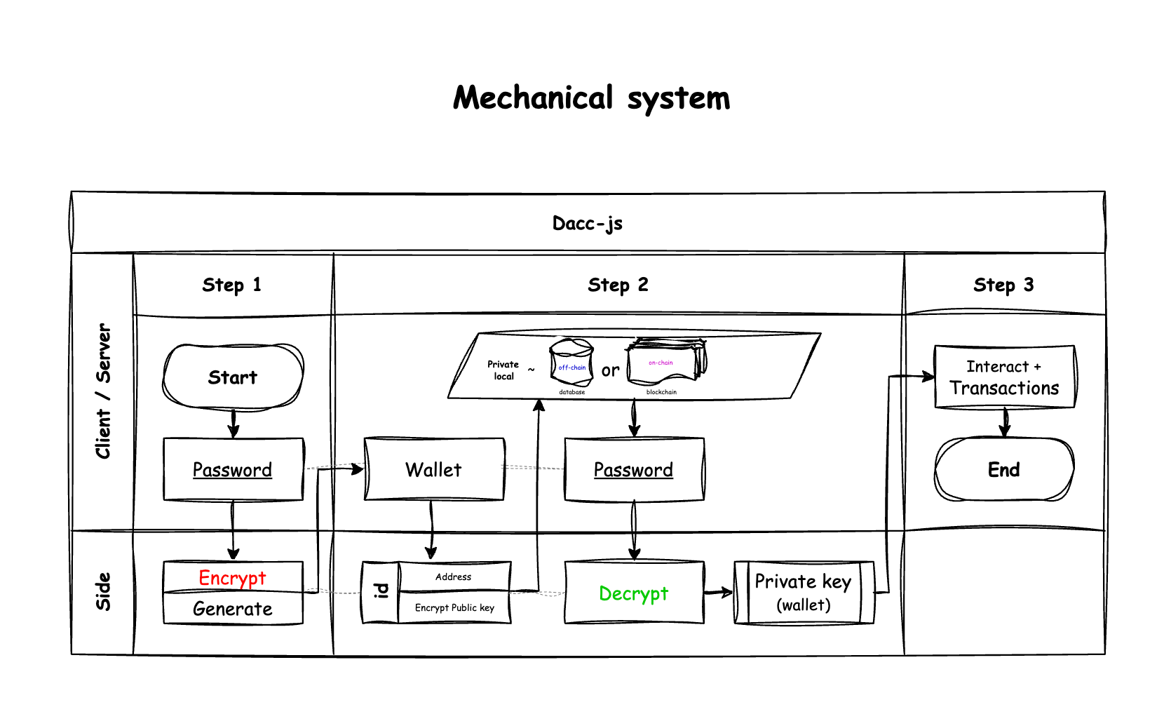 The Mechanical System in dacc-js defines the complete lifecycle of a wallet from creation, encryption, and storage, to recovery, keeping your private data safe and under your control. (referring to the user's device or trusted execution environment).