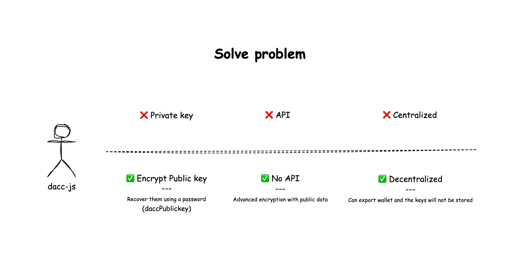 This diagram illustrates the Core Philosophy driving the design of the dacc-js library. The primary goal is to resolve fundamental issues often found in traditional Web3 wallets for Web2 solutions and services: reliance on intermediaries and data centralization.